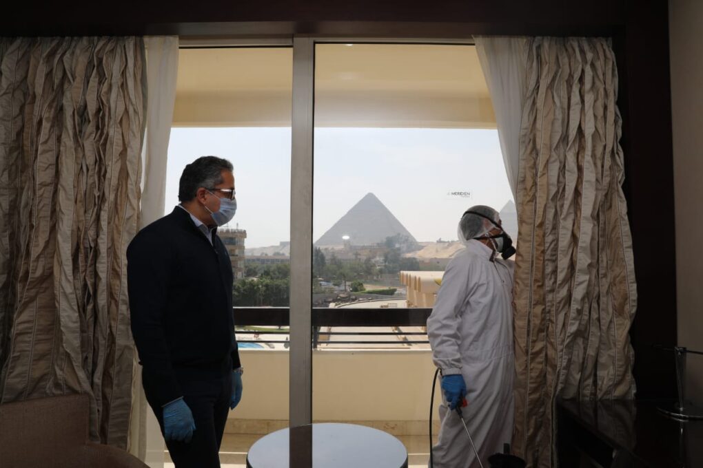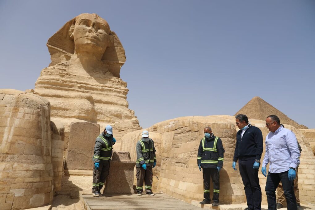O Αιγύπτιος Υπ. Αρχαιοτήτων και Τουρισμού Khaled el-Anani παρακολούθησε το πρωί της 30ης Μαρτίου 2020 την απολύμανση της Σφίγγας, της πυραμίδας του Χεφρίνου και της ευρύτερης περιοχής γύρω από τις πυραμίδες της Γκίζας. Πρόκειται για εντατικοποίηση των μέτρων που λαμβάνει η Αίγυπτος για την πρόληψη και την προστασία από τον κορονοϊό.