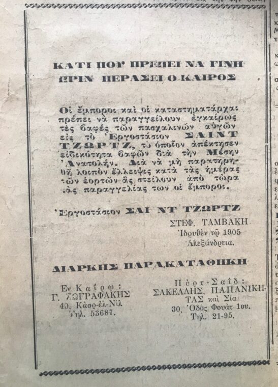 Εντύπωση προκαλεί η δεύτερη διαφήμιση του εργοστασίου παρασκευής και παραγωγής τροφίμων Σαιντ Τζωρτζ του Στέφανου Ταμβάκη, παππού του συνονόματου επίτιμου Προέδρου της Ελληνικής Κοινότητας Αλεξανδρείας, Μέλους του Δ.Σ. του Κοινωφελούς Ιδρύματος «Αλέξανδρος Σ. Ωνάσης» και τ. Προέδρου ΣΑΕ. Ο παππούς Στέφανος Ταμβάκης, γεννήθηκε στην Λήμνο και σε νεαρή ηλικία ήρθε στην Αίγυπτο στο τέλος του 19ου αιώνα, όπως πολλοί άλλοι Έλληνες λόγω, συνήθως, της χρεοκοπίας του 1897.Το εργοστάσιο Σαιντ Τζωρτζ ιδρύθηκε το 1905 στην Αλεξάνδρεια.