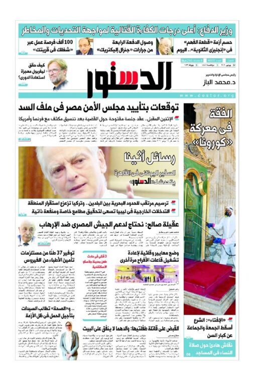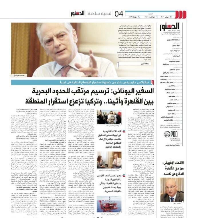 Η εφημερίδα Al-Dostour σε δημοσίευμα με ημερομηνία 27 Ιουνίου 2020 σε πρωτοσέλιδο τίτλο: «Τα Μηνύματα της Αθήνας: Ο Έλληνας Πρέσβης στο Κάιρο μιλάει στην Al-Dostour» φιλοξενεί στο εσωτερικό της εκτενέστατη εφ’ όλης της ύλης συνέντευξη του Πρέσβη της Ελλάδας στο Κάιρο, κ. Νικολάου Γαριλίδη. Απαντώντας στις ερωτήσεις της Δημοσιογράφου, Hala Amin ο κ. Γαριλίδης υπογράμμισε τα εξής: