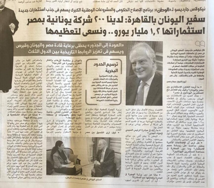 Η ημερήσια ε/φ Al-Watan σε δημοσίευσή της στις 29 Ιουνίου 2020 φιλοξενεί εκτενή συνέντευξη του Έλληνα Πρέσβη στο Κάιρο, κ. Νικολάου Γαριλίδη, δίνοντας ιδιαίτερη έμφαση στις δηλώσεις του για τις στρατηγικές σχέσεις Ελλάδας – Αιγύπτου, ιδίως όσον αφορά την οικονομική συνεργασία των δύο χωρών.