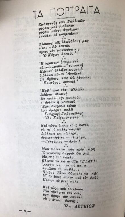Το χιούμορ κορυφώνεται όταν φτάνει στο τελευταίο τετράστιχο, αφού έχει εν τω μεταξύ αναφερθεί εκτός από τον θεολόγο, στους φιλολόγους αγγλικών και γαλλικών, στον Φυσικό εξ Ελλάδος και πιθανόν στον διευθυντή της Σχολής – χωρίς να αναφερθεί σε όνομα και ιδιότητα- για να καταλήξει:
