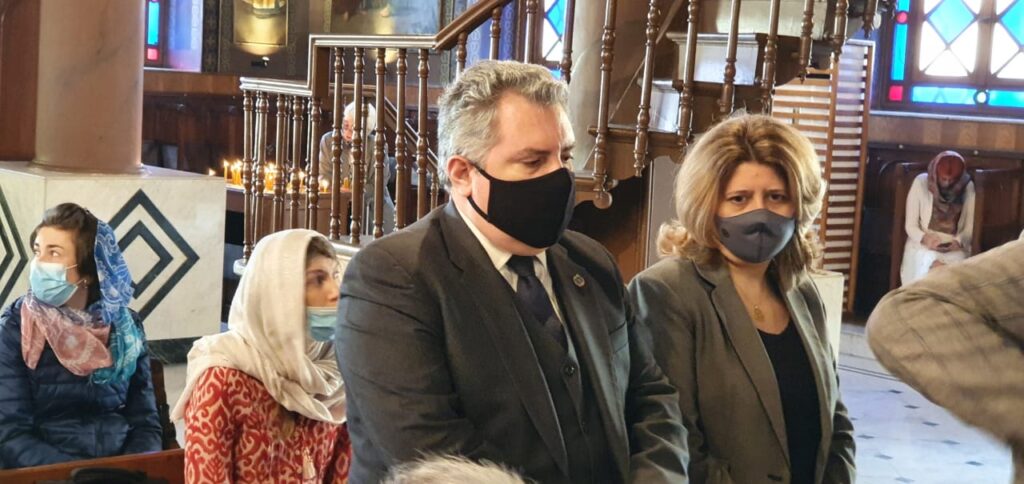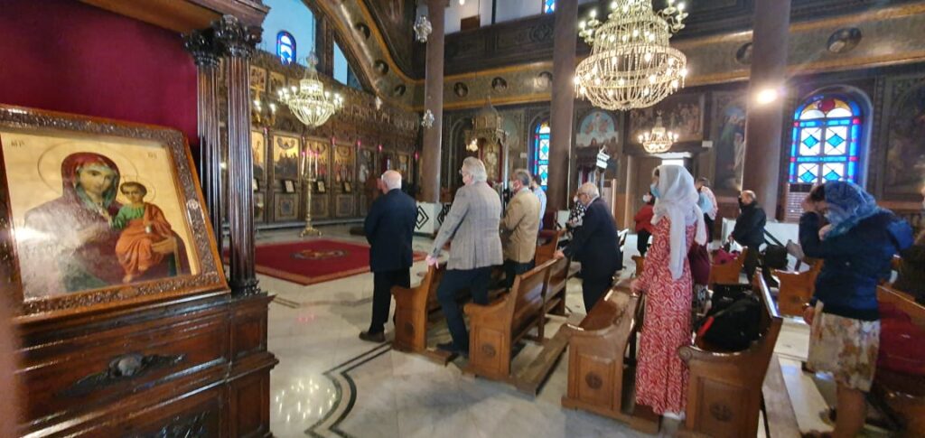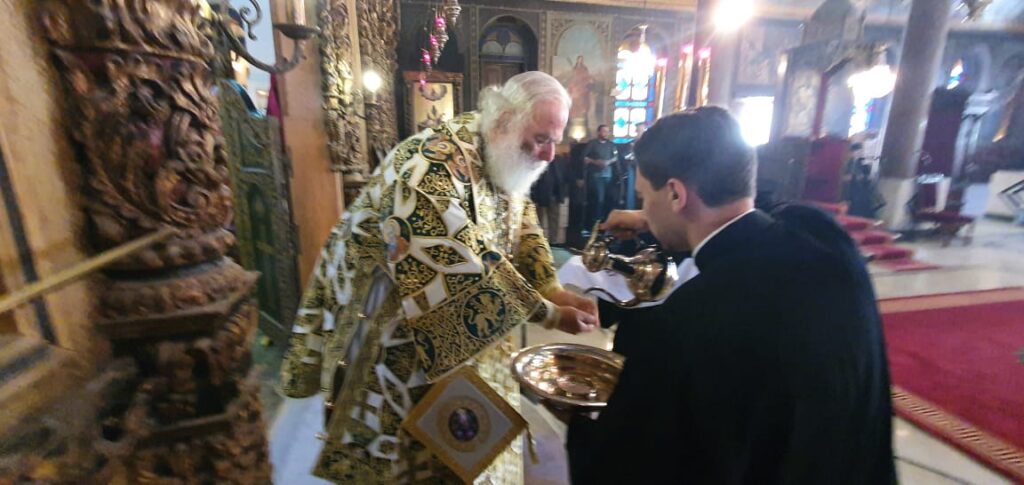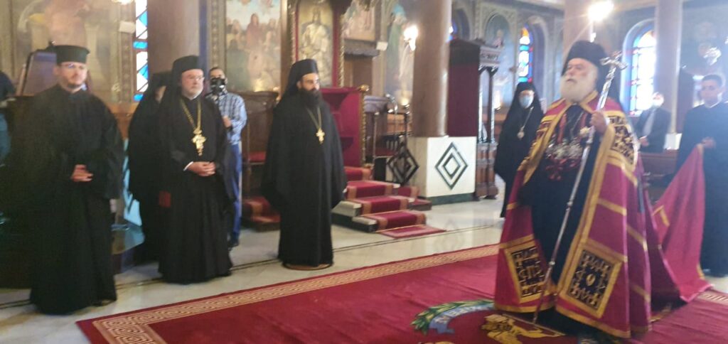 Τον Πατριάρχη Θεόδωρο πλαισίωσαν ο Μητροπολίτης Ερμουπόλεως κ. Νικόλαος, ο Πατριαρχικός Επίτροπος Καΐρου και Μητροπολίτης Μέμφιδος κ. Νικόδημος, ο Καθηγούμενος της Ι.Μ του Αγ. Γεωργίου Παλαιού Καΐρου, Αρχιμ. Δαμασκηνός Αλαζράι, ο Μ. Εκκλησιάρχης Αρχιμ. Στέφανος Σουλιμιώτης και κληρικοί του Πατριαρχείου Αλεξανδρείας και της Εκκλησίας της Ρουμανίας. Τους ύμνους έψαλλε ο Πρωτοψάλτης της Ε.Κ.Κ Ιωάννης Κούντριας.