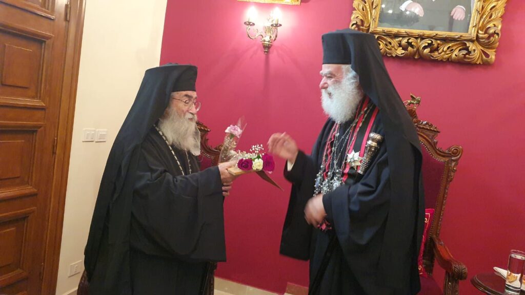 Αμέσως μετά ακολούθησε κέρασμα στην αίθουσα του θρόνου. Ο Πατριάρχης Θεόδωρος μαζί με τους ιεράρχες και τους ιερείς του Πατριαρχείου Αλεξανδρείας, έψαλλαν τη φήμη του Αρχιεπισκόπου Σινά που είχε τα γεννέθλιά του και του προσέφερε ένα δώρο.