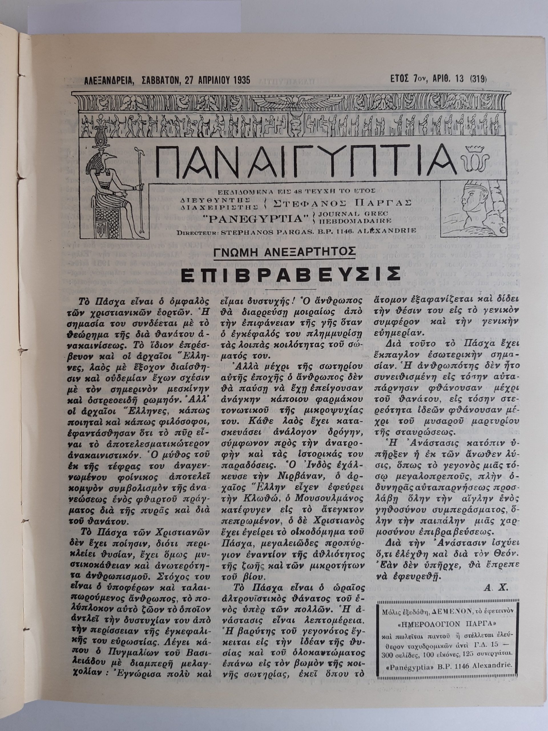 Την πασχαλιάτικη ύλη της εφημερίδας συμπλήρωναν άρθρα για το πως οι Αιγυπτιώτες Έλληνες γιόρταζαν το Πάσχα, όπως τη Μεγάλη Εβδομάδα στο ναό του «Ευαγγελισμού» στην Αλεξάνδρεια, τη χορωδία του Μουζακίδη στο Σουέζ, πασχαλινά έθιμα, και γιορτές των Δωδεκανησίων (δεξιώσεις, χορούς), λίγο πριν και μετά το Πάσχα.