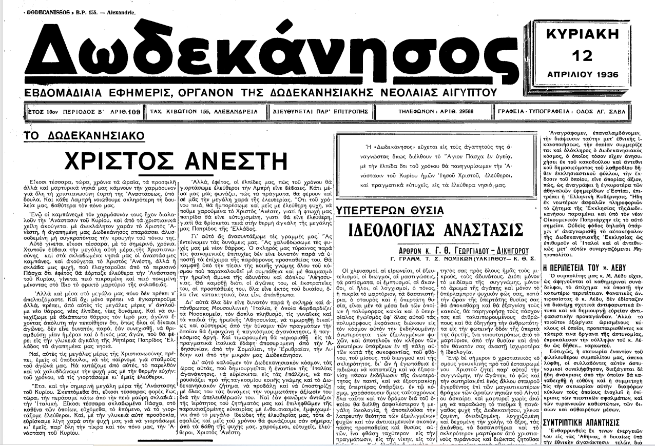 Η σύνδεση της γιορτής του Πάσχα με την Ιταλική κυριαρχία των νησιών ήταν έντονη μέσα από τα πύρινα άρθρα της εφημερίδας Δωδεκάνησος/LeDodecanese, δημοσιογραφικό όργανο της Κεντρικής Επιτροπής των Ενώσεων Δωδεκανησίων Αιγύπτου, και μοναδική δωδεκανησιακή εφημερίδα που εκδιδόταν στην Αίγυπτο την περίοδο 1925-1937. Τα γραφεία της εφημερίδας ήταν στην Αλεξάνδρεια.