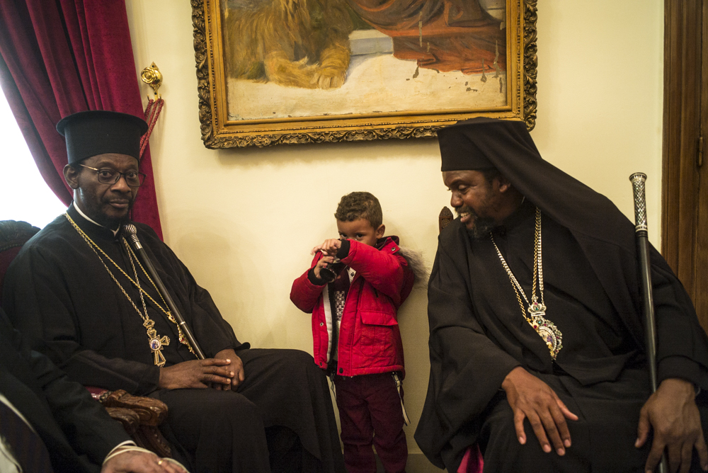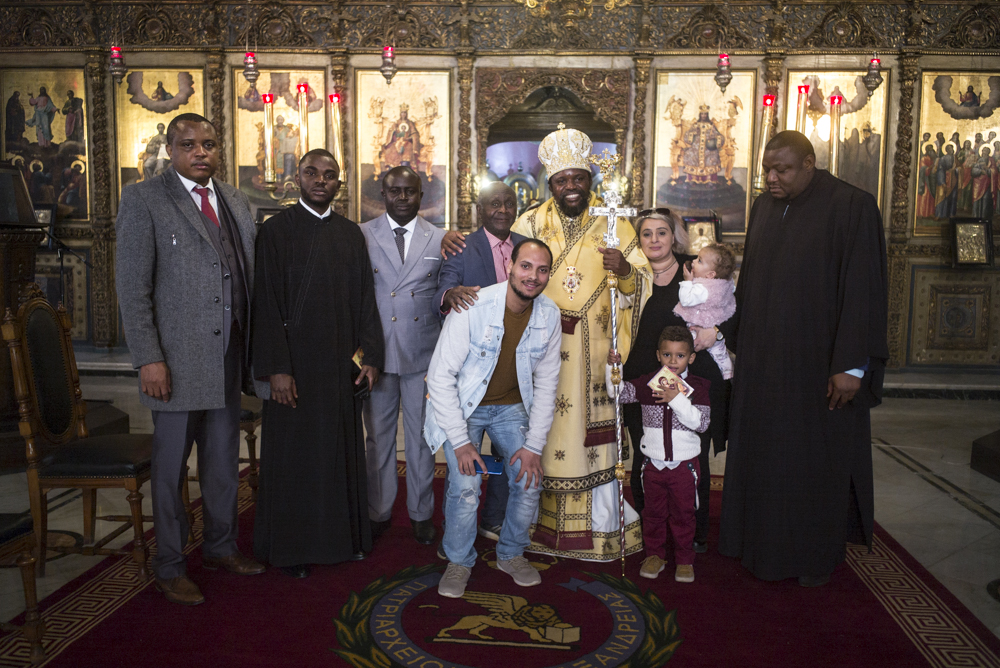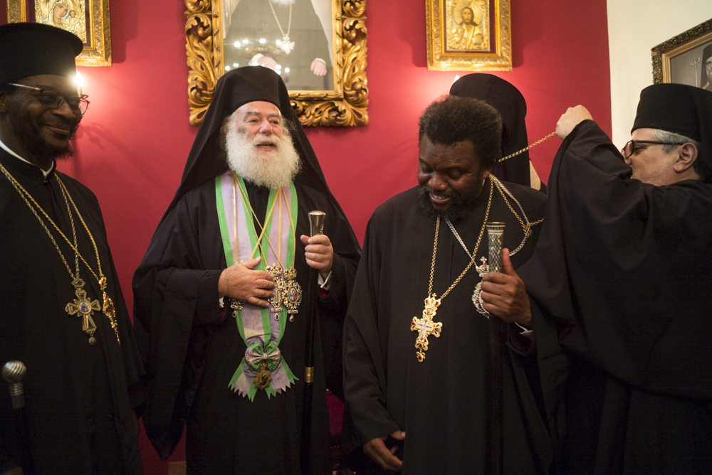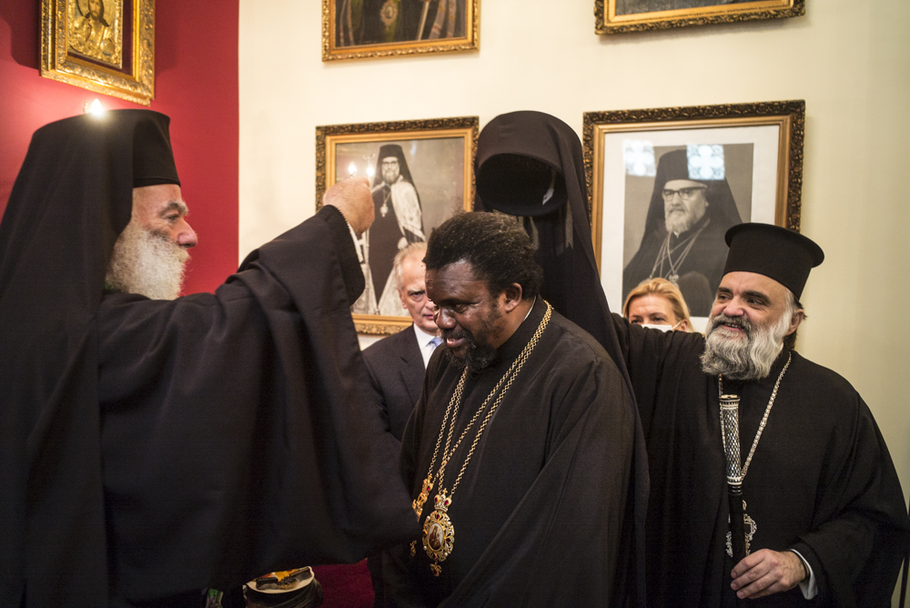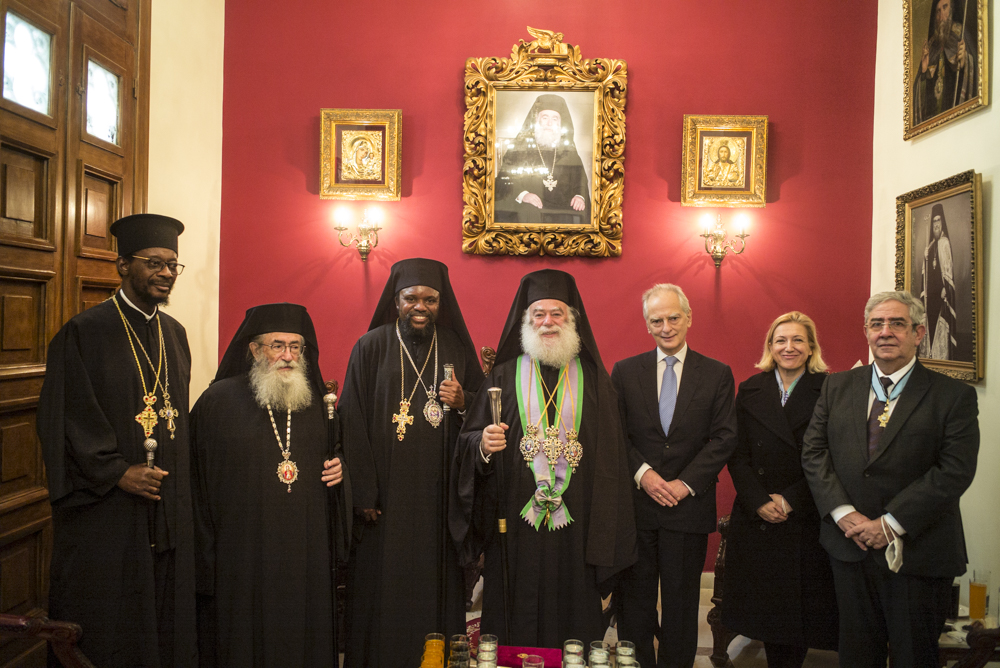 Μετά τις ευχές που αντάλλαξε με τους παριστάμενους αλλά και τις αναμνηστικές φωτογραφίες κατευθύνθηκε με τους συγγενείς και τους φίλους του στην Αίθουσα του Θρόνου, όπου ο Μακαριώτατος τον υποδέχτηκε και του χάρισε ένα υπέροχο εγκόλπιο που όπως είπε το προσφέρει σε όλα του τα παιδιά μετά την χειροτονία τους και απεικονίζει την «φυγή στην Αίγυπτο» για να θυμάται τους πρόσφυγες του κόσμου, τους ξένους, τους φτωχούς Αφρικανούς όπως επίσης και ένα καλαίσθητο μπαστούνι από το Χάν Έλ Χαλίλι για το κρατάει όταν θα οδοιπορεί στην Αφρική.