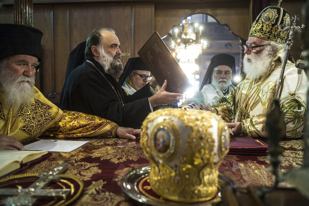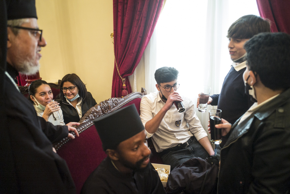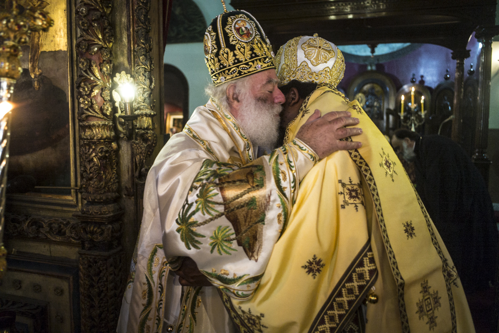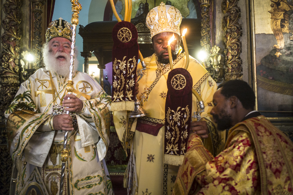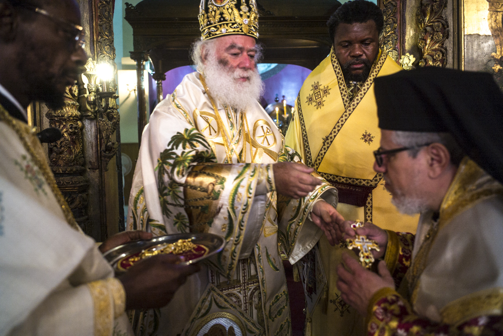 Μετά τις ευχές που αντάλλαξε με τους παριστάμενους αλλά και τις αναμνηστικές φωτογραφίες κατευθύνθηκε με τους συγγενείς και τους φίλους του στην Αίθουσα του Θρόνου, όπου ο Μακαριώτατος τον υποδέχτηκε και του χάρισε ένα υπέροχο εγκόλπιο που όπως είπε το προσφέρει σε όλα του τα παιδιά μετά την χειροτονία τους και απεικονίζει την «φυγή στην Αίγυπτο» για να θυμάται τους πρόσφυγες του κόσμου, τους ξένους, τους φτωχούς Αφρικανούς όπως επίσης και ένα καλαίσθητο μπαστούνι από το Χάν Έλ Χαλίλι για το κρατάει όταν θα οδοιπορεί στην Αφρική.