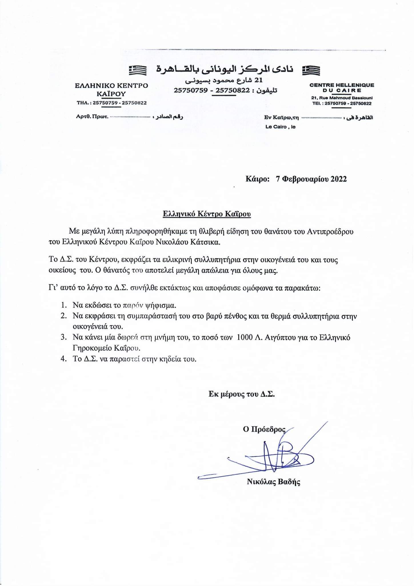 Την Τετάρτη 23 Φεβρουαρίου στις 2 το μεσημέρι στο Γ΄ Κοιμητήριο Αθηνών, θα ψαλλεί η εξόδιος ακολουθία του Νικόλα Κάτσικα που έφυγε τόσο ξαφνικά από την ζωή και η είδηση του θανάτου του γέμισε με πόνο όλους ΄όσους τον γνώριζαν.
