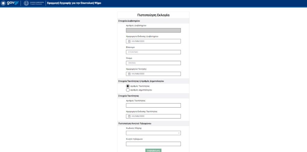 εκλογέας του εσωτερικού μπορεί να συνδεθεί στην εφαρμογή epistoliki.ypes.gov.gr κάνοντας χρήση των προσωπικών κωδικών taxisnetκαι επιβεβαιώνοντας το κινητό του τηλέφωνο και το email του με κωδικό μίας χρήσης (OTP).