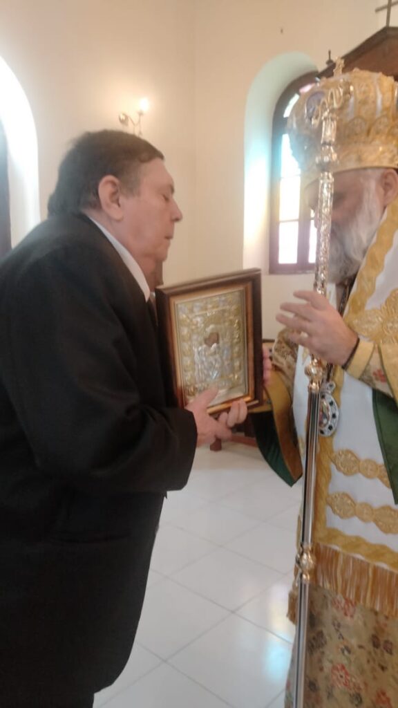 Στη συνέχεια, ο Θεοφιλέστατος προσέφερε με αγάπη στον Ταμία της Ελληνικής Κοινότητας Καΐρου και ΠροΪστάμενο του Νοσοκομείου κ. Αντώνη Ιορδανίδη, προς τιμή του Ιερού Ναού, μία εικόνα της Παναγίας του «Άξιον Εστί», την οποία του δώρισε, κατά την πρόσφατη επίσκεψή του στο Άγιο Όρος, ο Πρώτοεπιστάτης του Όρους, Μοναχός Αβραάμ.