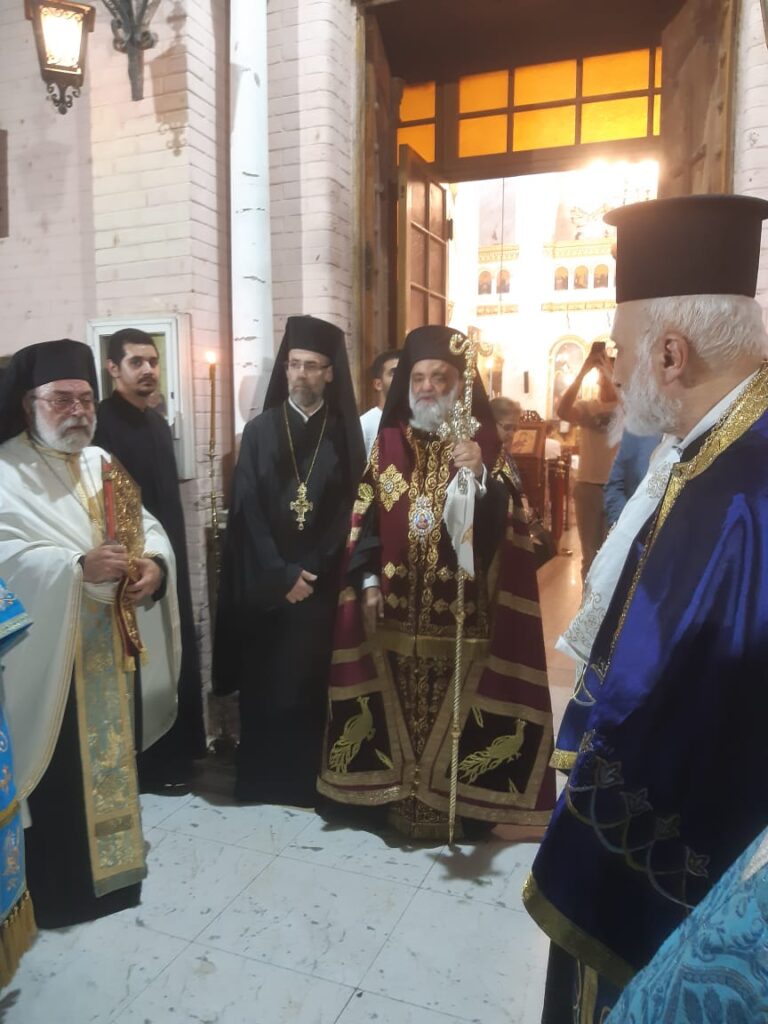 Πανηγυρικός και Αρχιερατικός ο Εσπερινός μετά αρτοκλασίας στην εκκλησία της Παναγίας στην Ηλιούπολη με τον Θεοφιλέστατο Επίσκοπο Ιππώνος Στέφανο να χοροστατεί στην Ακολουθία. Το Ιερό Βήμα πλαισίωσαν ο Πρωτοσύγκελος της Ιεράς Μητροπόλεως Μέμφιδος Πανοσιολογιώτατος Αρχιμαδρίτης Μιχαήλ, οι Πανοσιολογιώτατοι Αρχιμανδρίτες Ιωακείμ, Θεόδωρος και Κωνσταντίνος, οι πατέρες Γιούσεφ και Παύλος. Τους ύμνους έψαλε ο Πρωτοψάλτης της Ελληνικής Κοινότητας Καΐρου κ. Κωνσταντίνος Μιχαλακόπουλος με τον Αραβόφωνο Πρωτοψάλτη κ. Τόνυ Ατάλα και ομάδα ψαλτών.