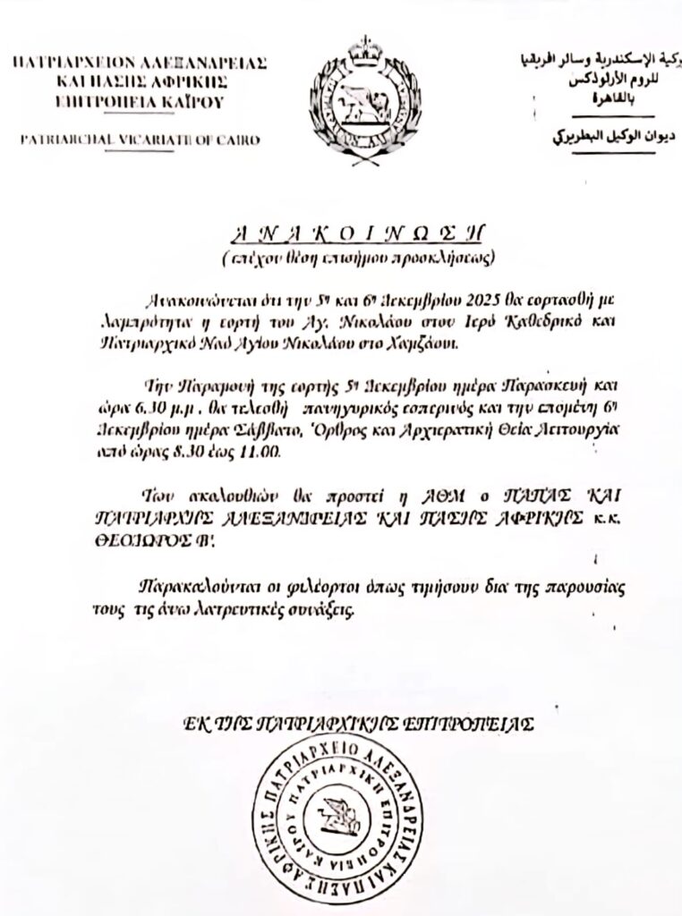 Πατριαρχείο Αλεξανδρείας και Πάσης Αφρικής. Ανακοίνωση