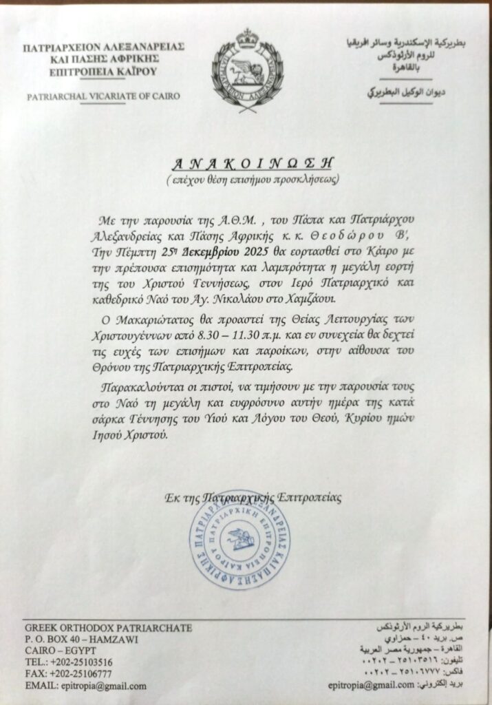 Αυτά τα Χριστούγεννα, αγοράστε τα δώρα για τους αγαπημένους σας και ενισχύστε έμπρακτα τους συνανθρώπους μας σε ανάγκη. Από την Παροικία μας στο Καΐρο θα συμμετέχει […]