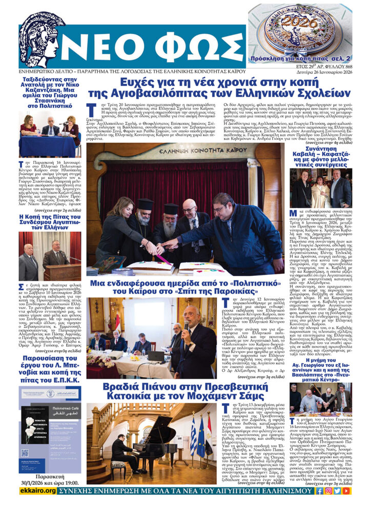 Την Δευτέρα 12 Ιανουαρίου 2026 στο εντευκτήριο του Συνδέσμου Αιγυπτιωτών Ελλήνων, ο Σύλλογος Ελλήνων Καΐρου, στα πλαίσια των Πολιτιστικών του εκδηλώσεων, παρουσίασε την πρώτη του εκδήλωση […]
